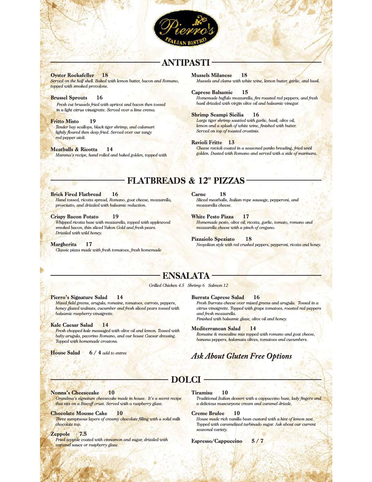 Pierro’s Italian Bistro’s menu is filled with beloved classics, such as lasagna, chicken parmigiana, and tiramisu. With our array of time-honored dishes, we aim to capture the rich, sensory flavors of authentic Italian cuisine in one place. For more information, feel free to get in touch with us today.